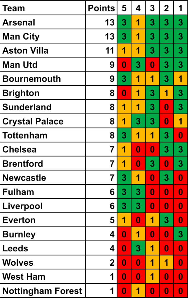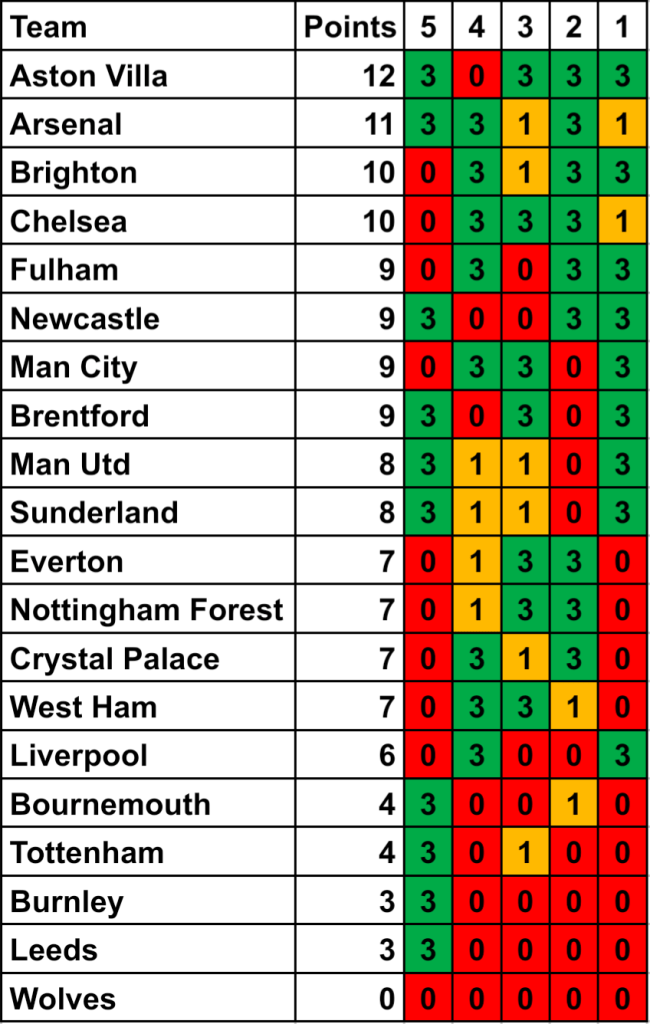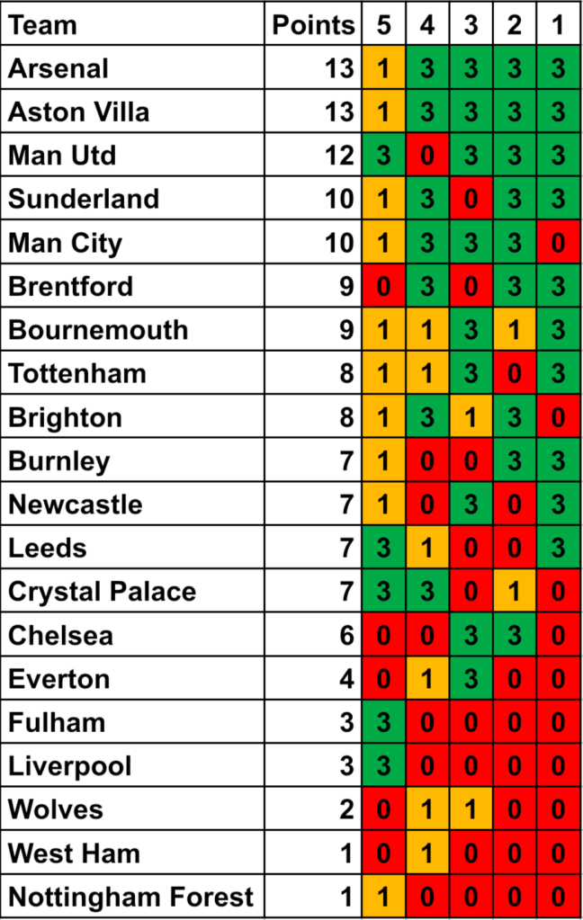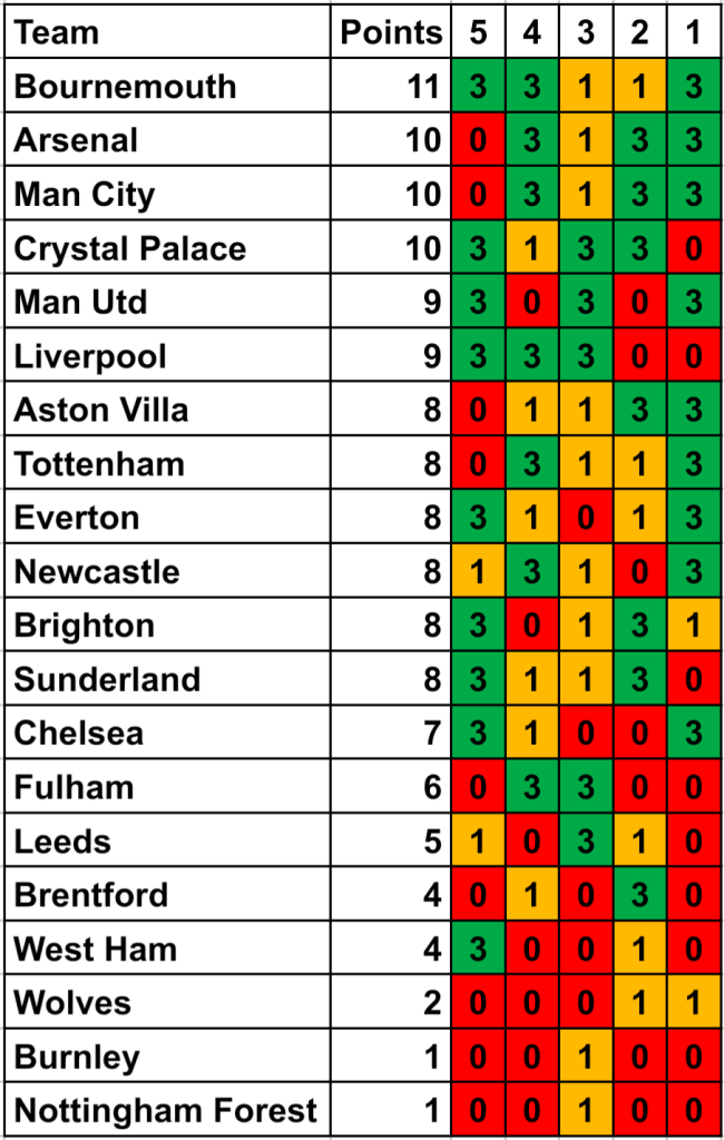 Form table based on the last 5 Premier League games up to 5th October 2025.