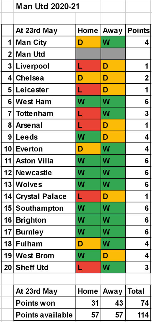 Away form: 12 Wins, 7 Draws, 0 Losses = 43 points