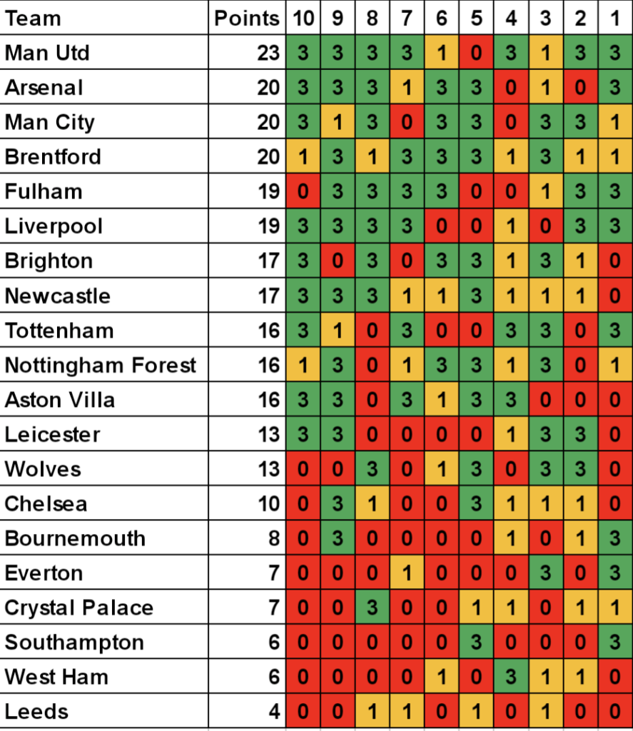 Form table based on the last 10 Premier League games up to 19th February 2023.