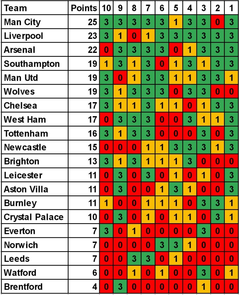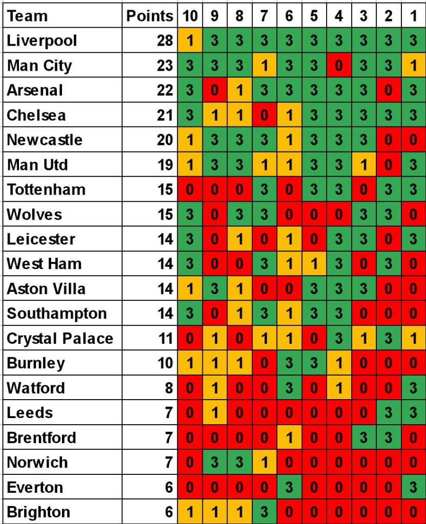 Form table based on the last 10 Premier League games up to 20th March 2022.