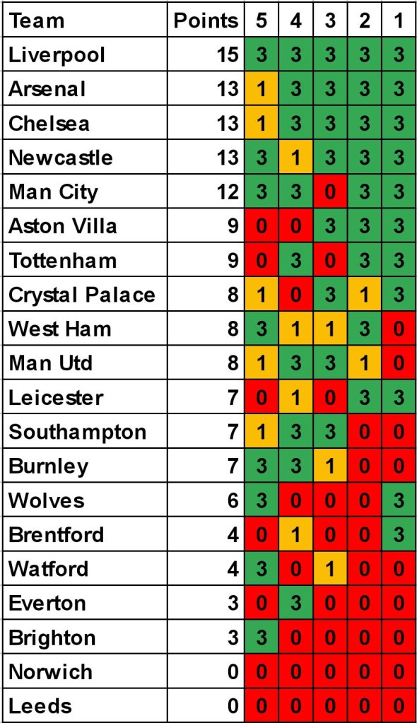 Form table based on the last 5 Premier League games up to 2nd May 2022.