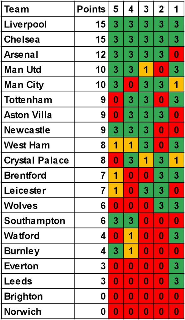 Form table based on the last 5 Premier League games up to 20th March 2022.