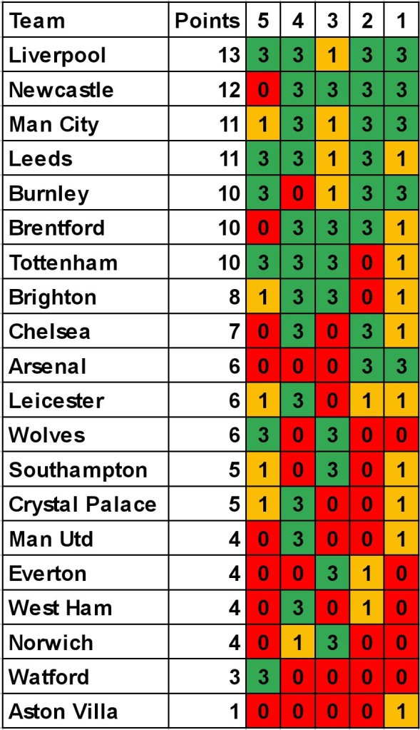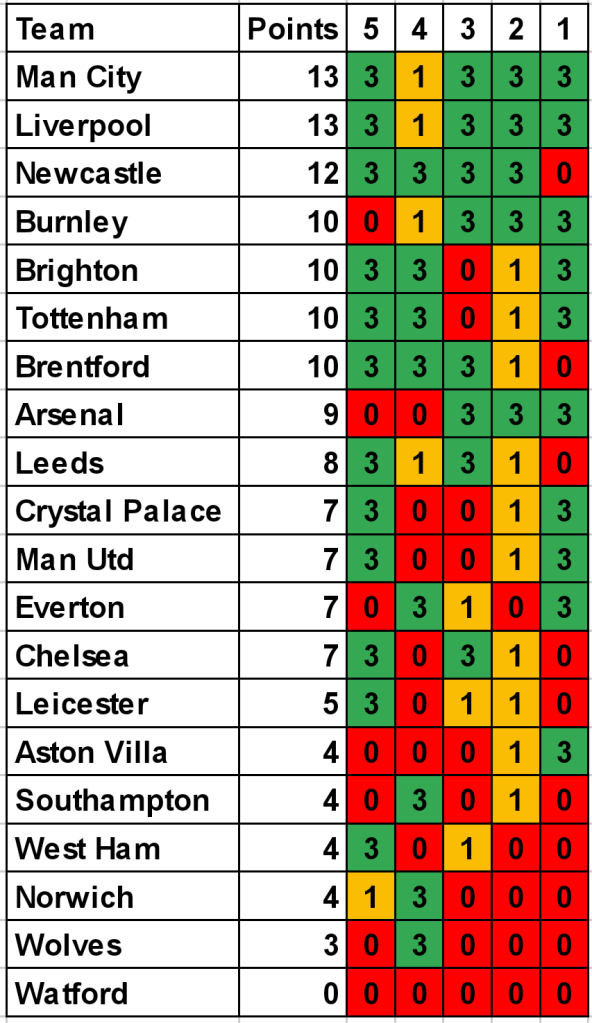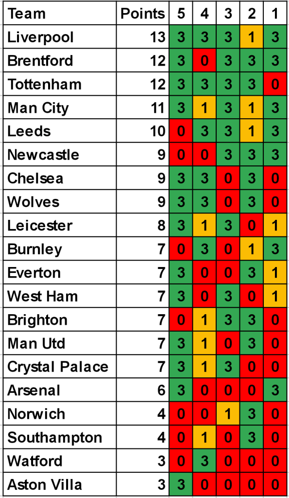 Form table based on the last 5 Premier League games up to 10th March 2022.
