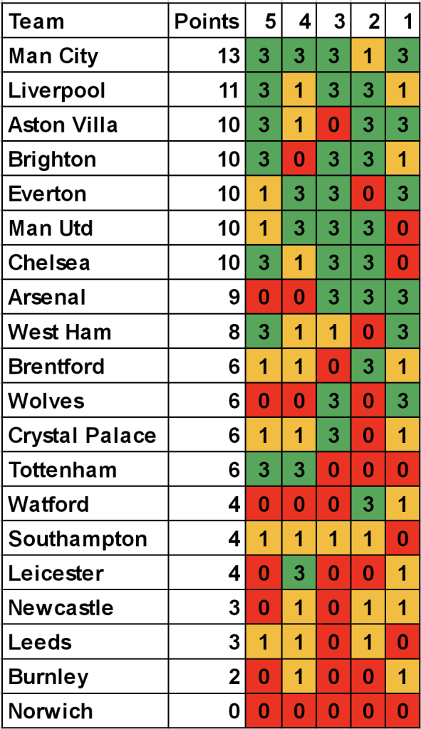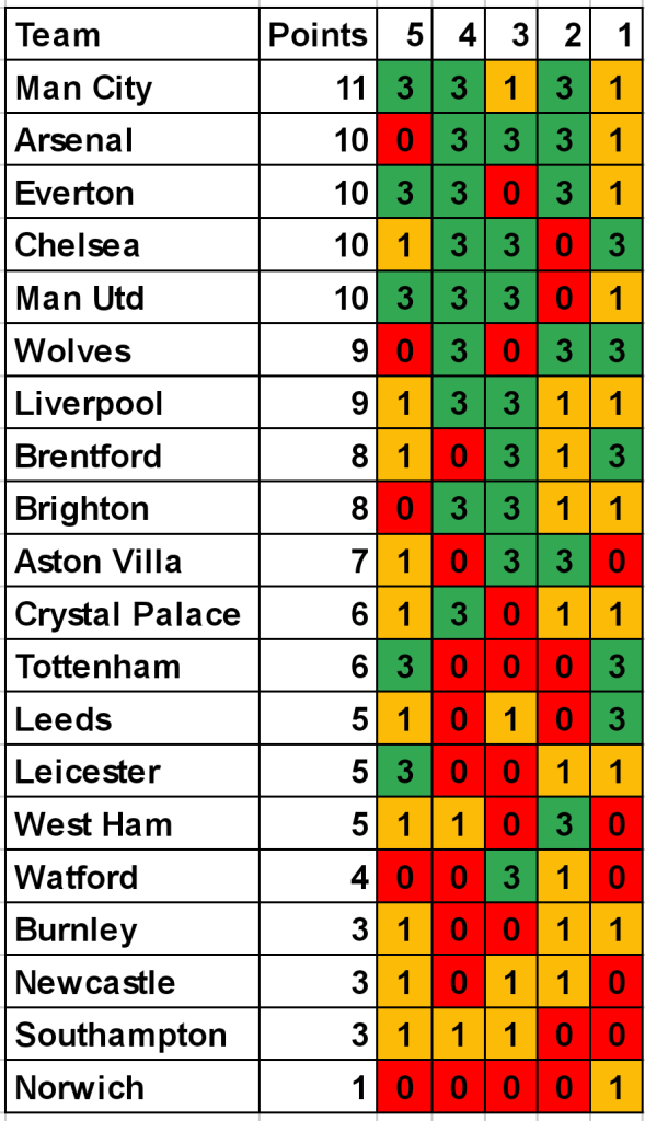 Form table based on the last 5 Premier League games up to 3rd October 2021.