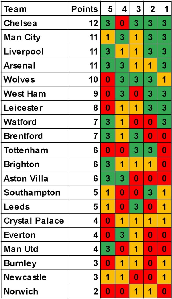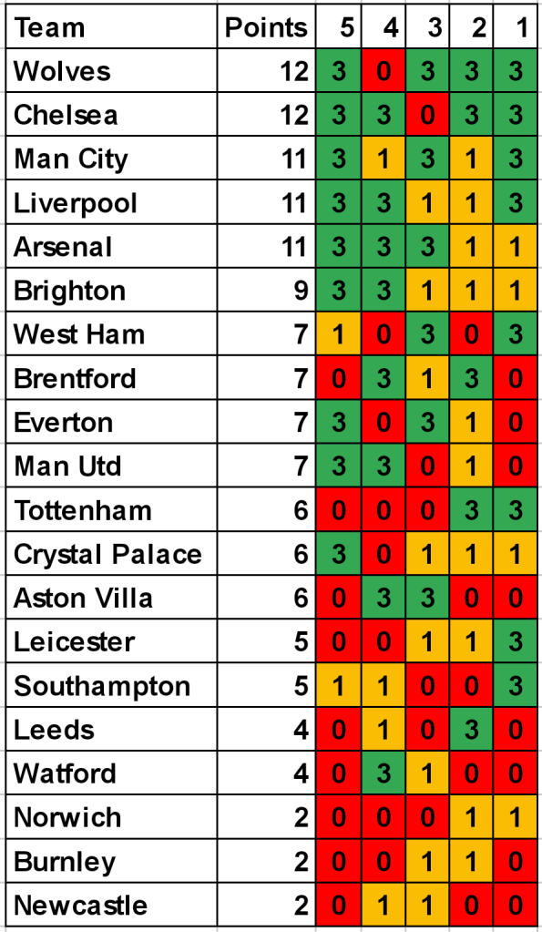 Form table based on the last 5 Premier League games up to 19th September 2021.