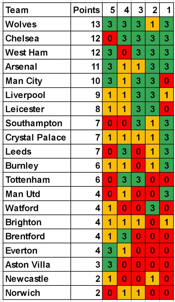 Form table based on the last 5 Premier League games up to 18th October 2021.