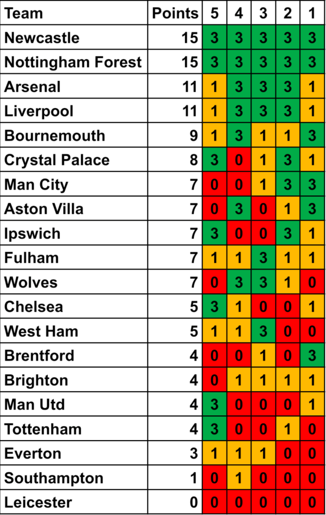 Form table based on the last 5 Premier League games up to 1st January 2025.