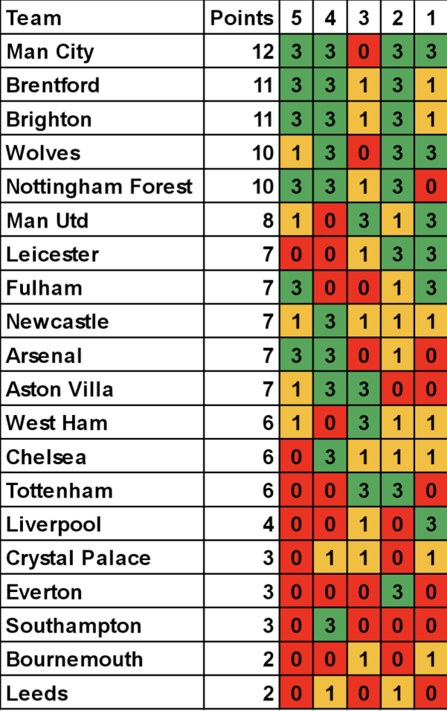 Form table based on the last 5 Premier League games up to 4th May 2023.